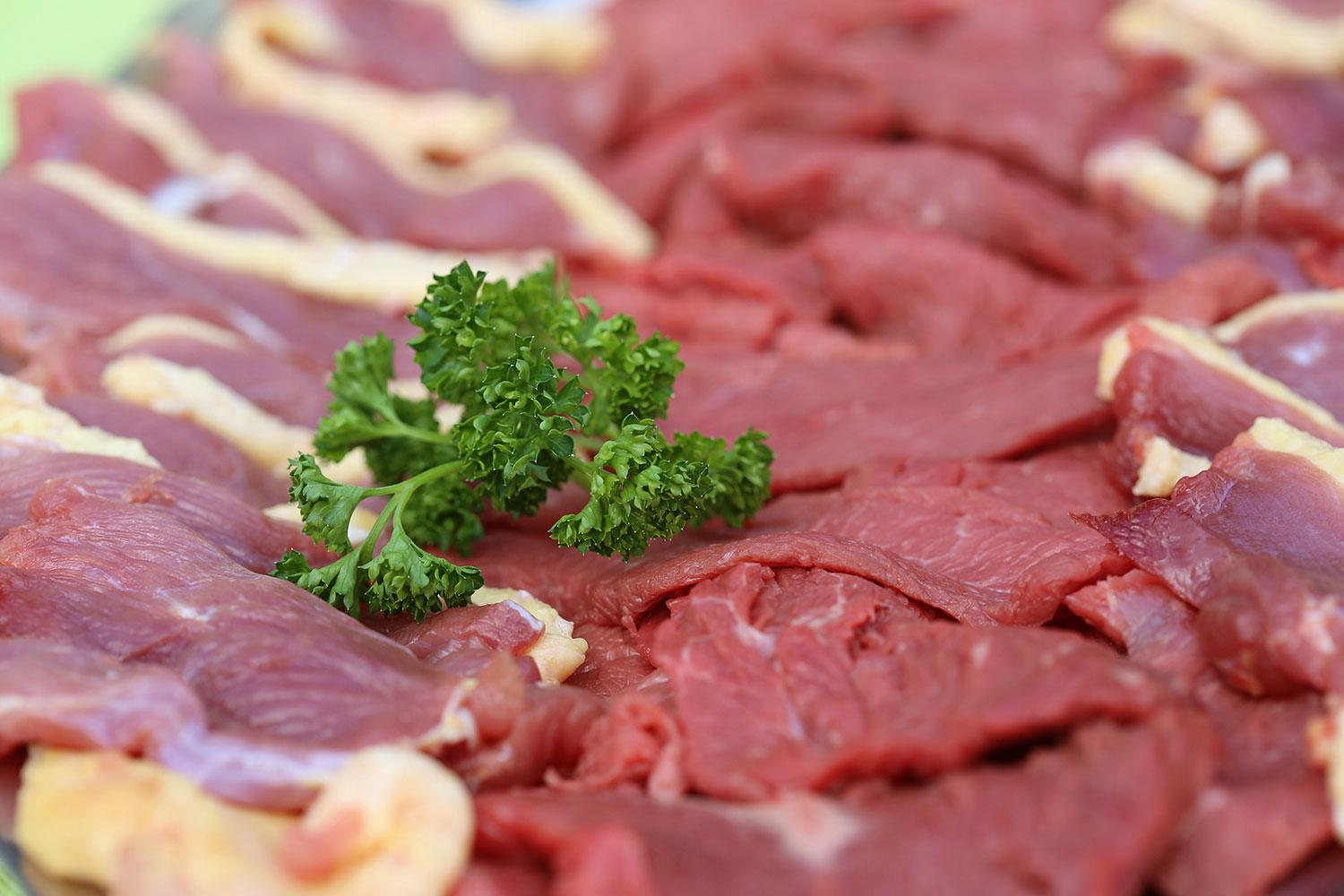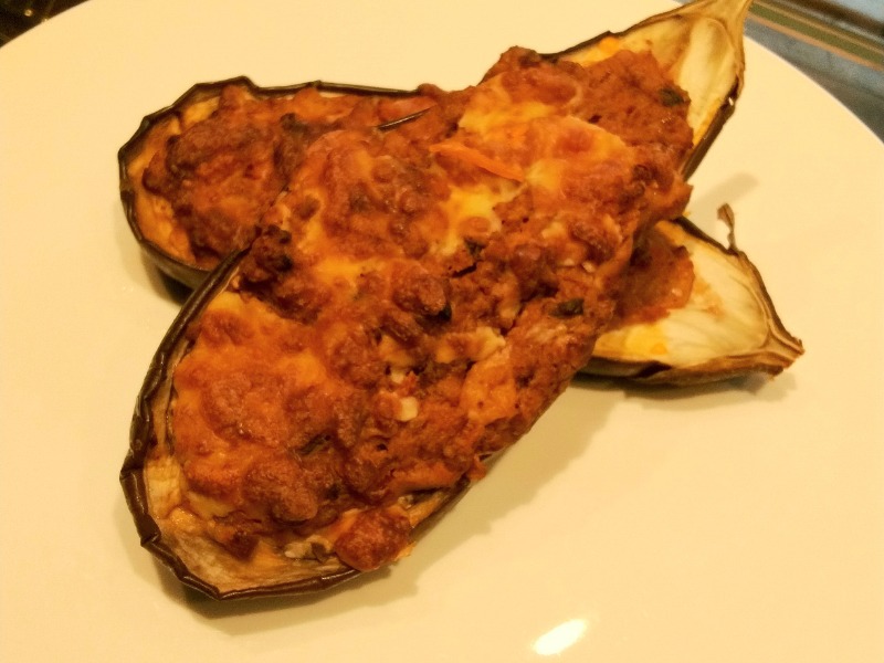 Aubergine farcie a la viande hachée, sauce tomate, basilic, parmesan et mozzarella.