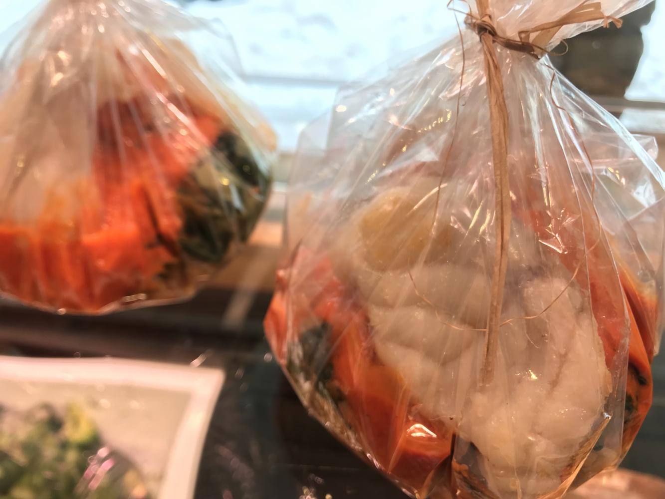 papillote de lotte avec garniture et légumes.sauce beurre blanc.